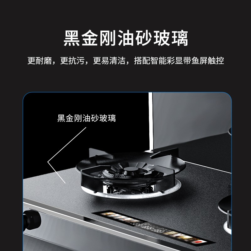 除卻外觀上的美學,臺面采用黑金剛油砂玻璃材質,無懼廚房油污,一擦即凈。搭配智能彩顯帶魚屏觸控,整體臺面質感十足。